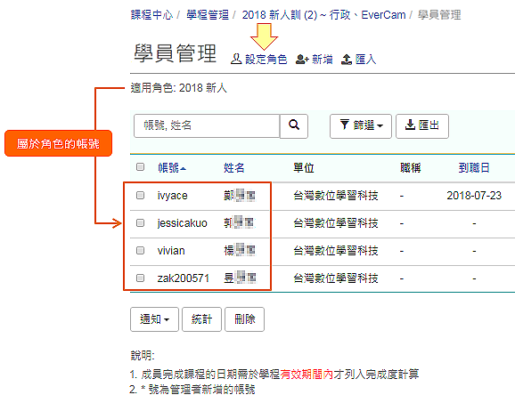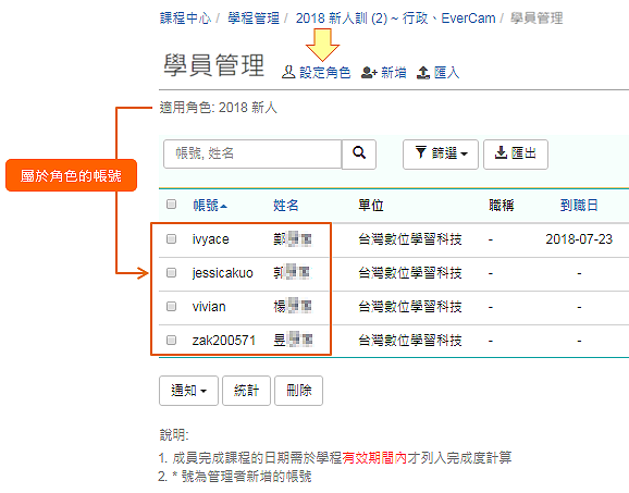 除了直接加入帳號之外,也可以透過設定「角色」的方式來加入帳號。例如,透過「設定角色」的功能將「2018 新人」的角色加入後,只要屬於這個角色的帳號,就會自動被加入學程以及其中所設定的課程。