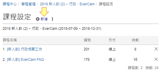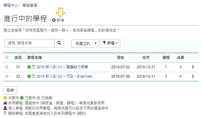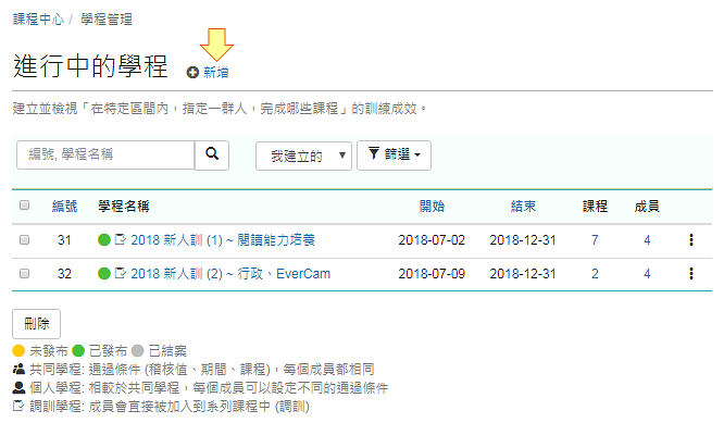 從「課程中心 / 學程管理」,點擊「新增」,即可建立調訓學程。
