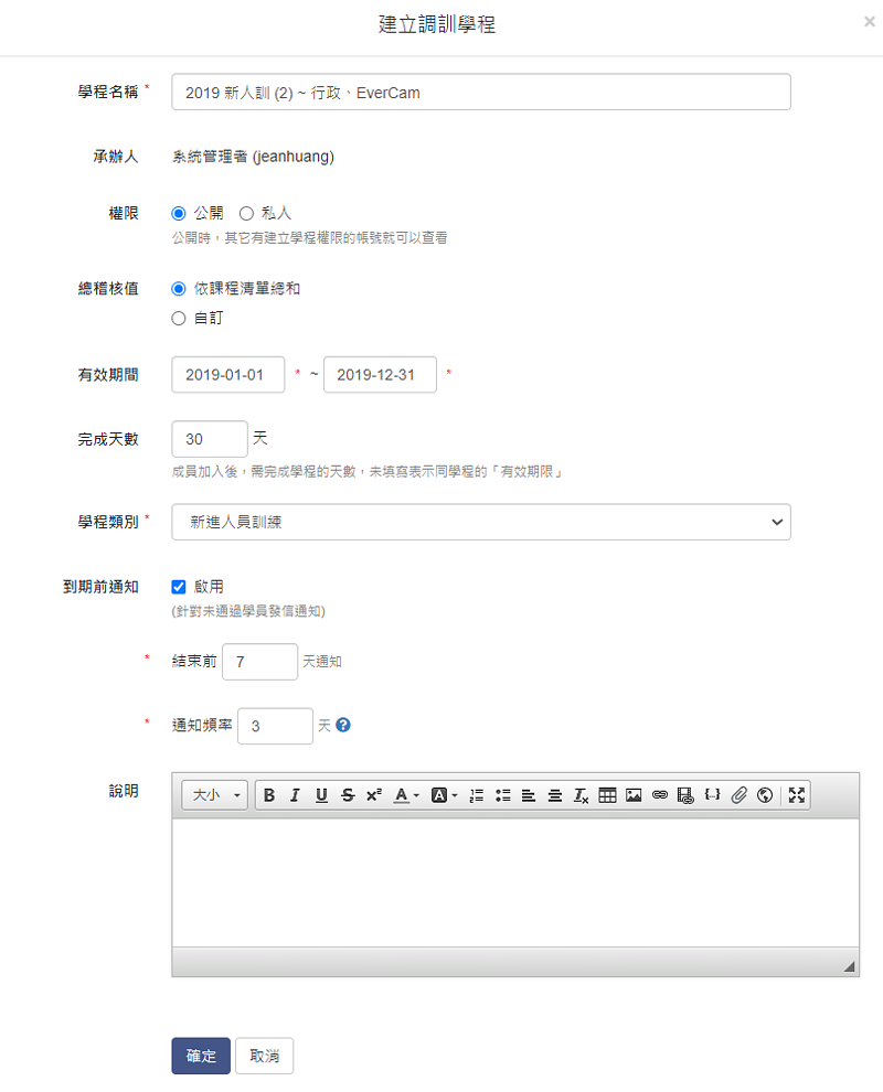 可以透過「完成天數」來滿足到職後幾天內要完成指定課程的需求,重要欄位說明如下: