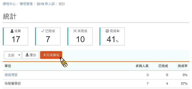 系統可以設定自動通知外,也允許人工通知,進入「統計」,點擊「未完成通知」,就可以通知所有未完成的學員。