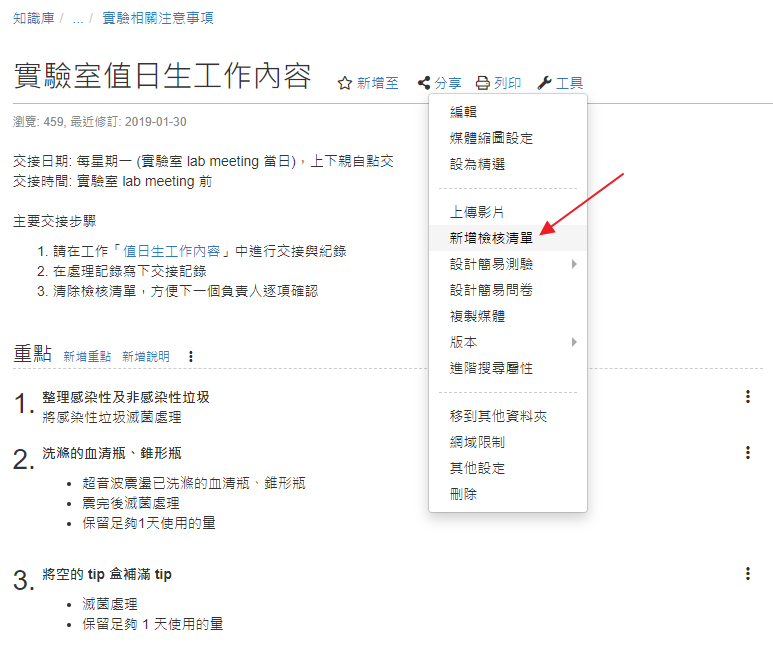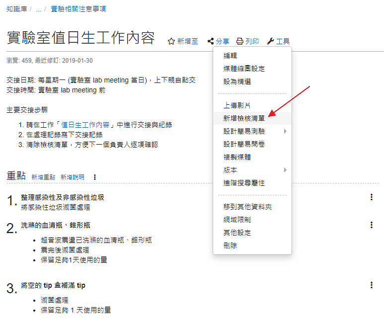 km+ 提供 SOP 與檢核清單的機制,更清楚規範與撰寫每一個步驟,因為線上排版與編輯都很容易,就可以減少使用 word 下載、編輯後再次上傳的不便而導致每個人電腦都有自己版本的問題。