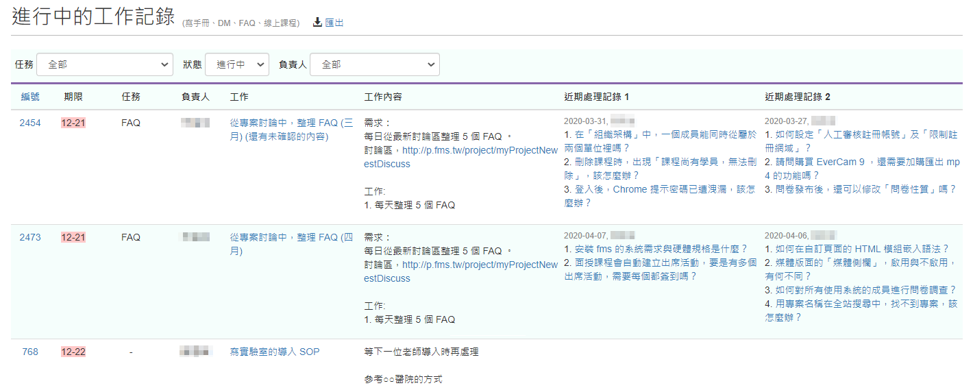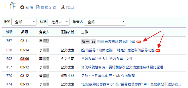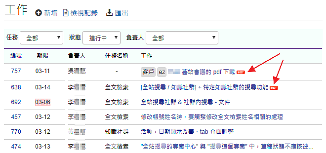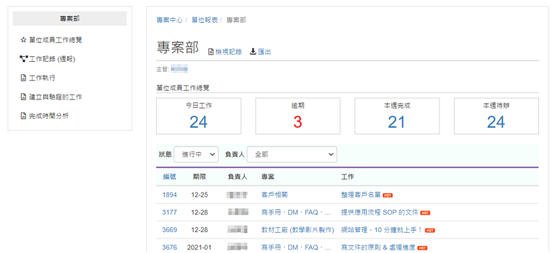 可以查看專案或團隊中成員的工作內容與最近紀錄詳細列表,快速瀏覽整體工作狀態,例如哪些工作已經過期,並從紀錄中快速得知原因。