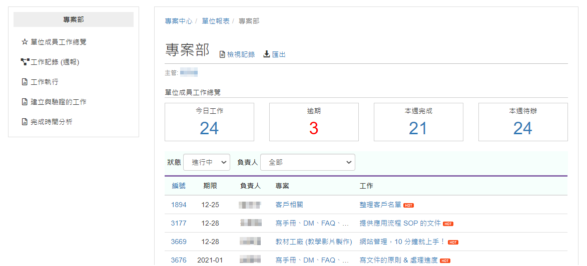 單位主管可以看到部門內所有同仁的工作列表與統計,或是查詢個別同仁的工作週報。
