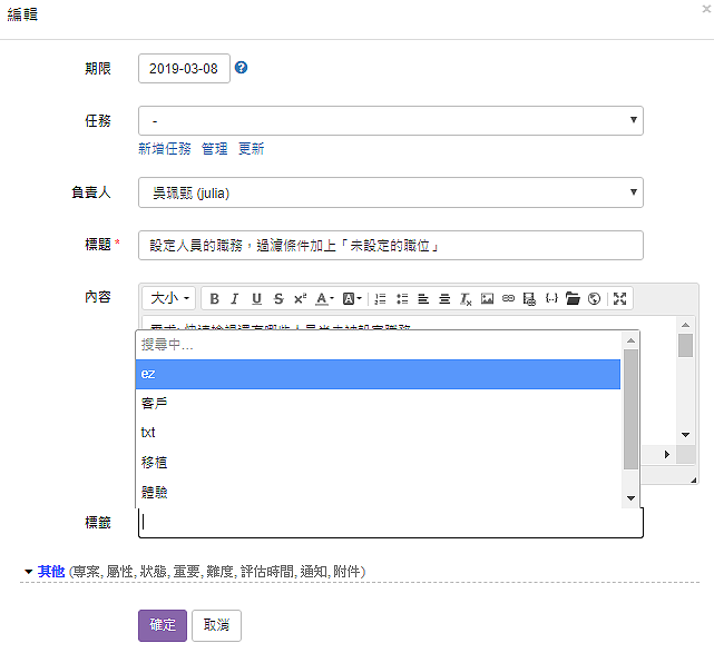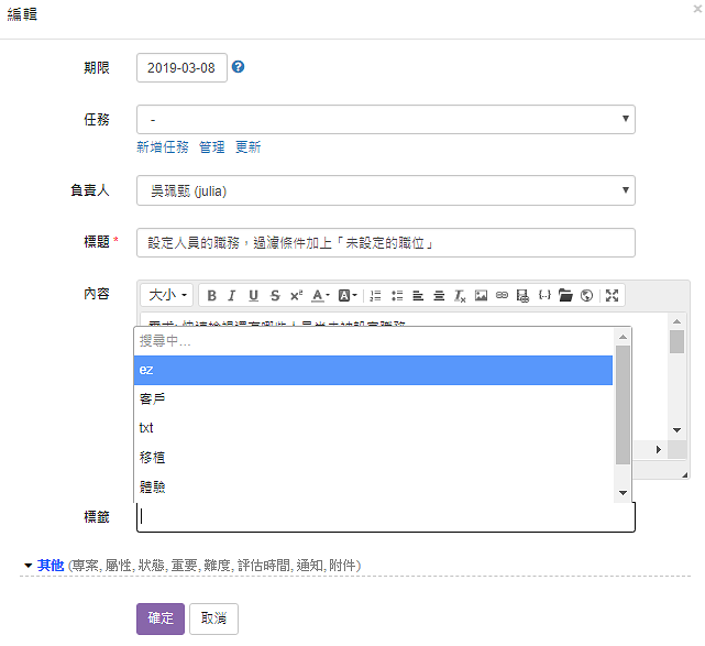 雖然任務是工作分類的一種,但標籤可以看成是不同面向的分類,幫助我們將工作進行標示或提醒,例如: