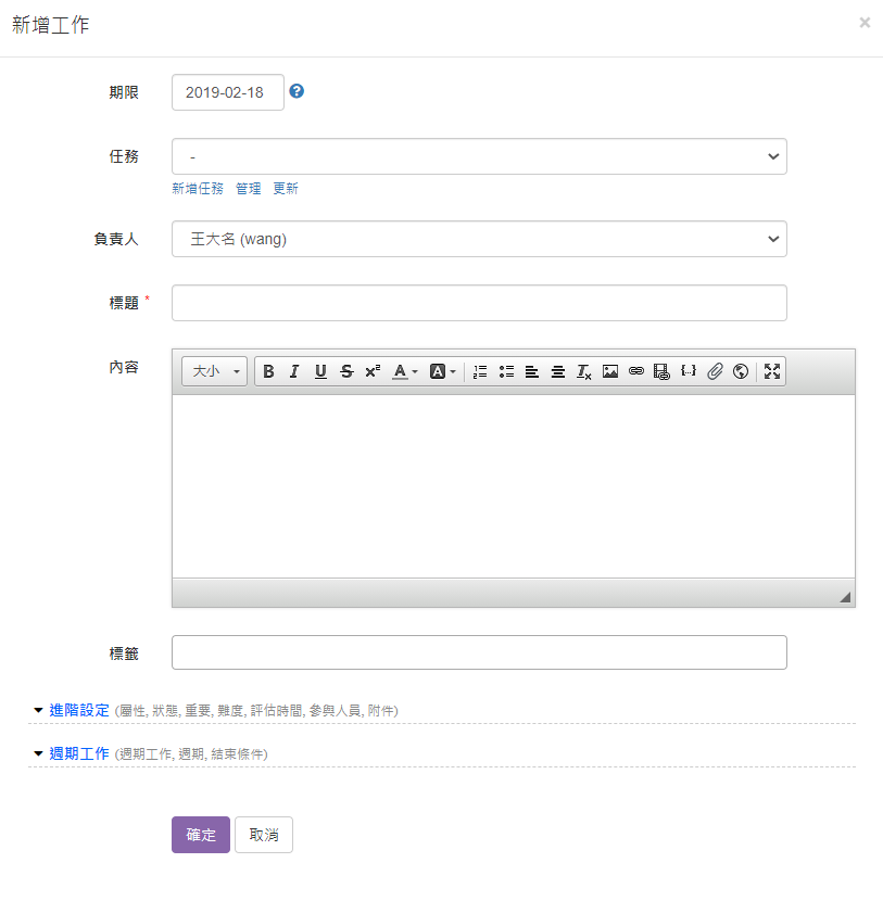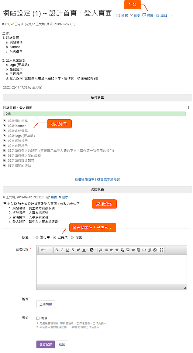 建立工作、指派負責人、設定完成期限