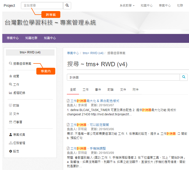 可以跨專案搜尋 or 只搜尋專案內,快速找到工作當初設計的考量、遇到的問題、背景 ... 等重要資訊,這就是知識管理很難記錄的「經驗」。
