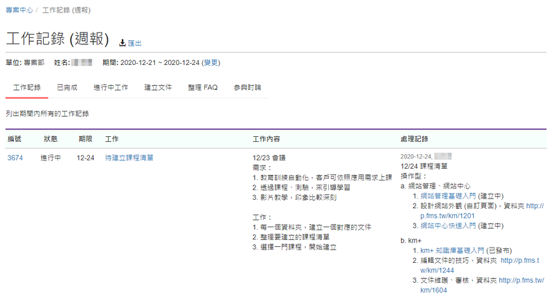 提供個人檢視當週詳細的工作相關記錄,包括已完成、進行中工作、建立的文件、FAQ、參與的討論等。