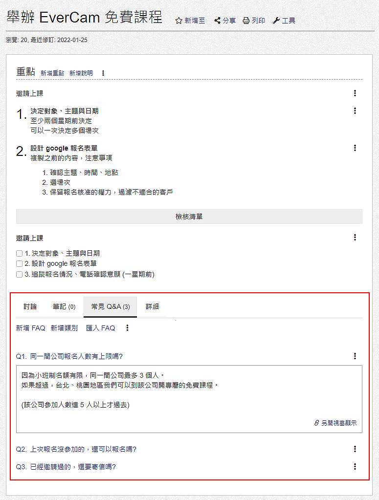 方便有效地紀錄「經驗」 (SOP、FAQ、案例、討論過程、...)、容易找得到、實用的權限管理。